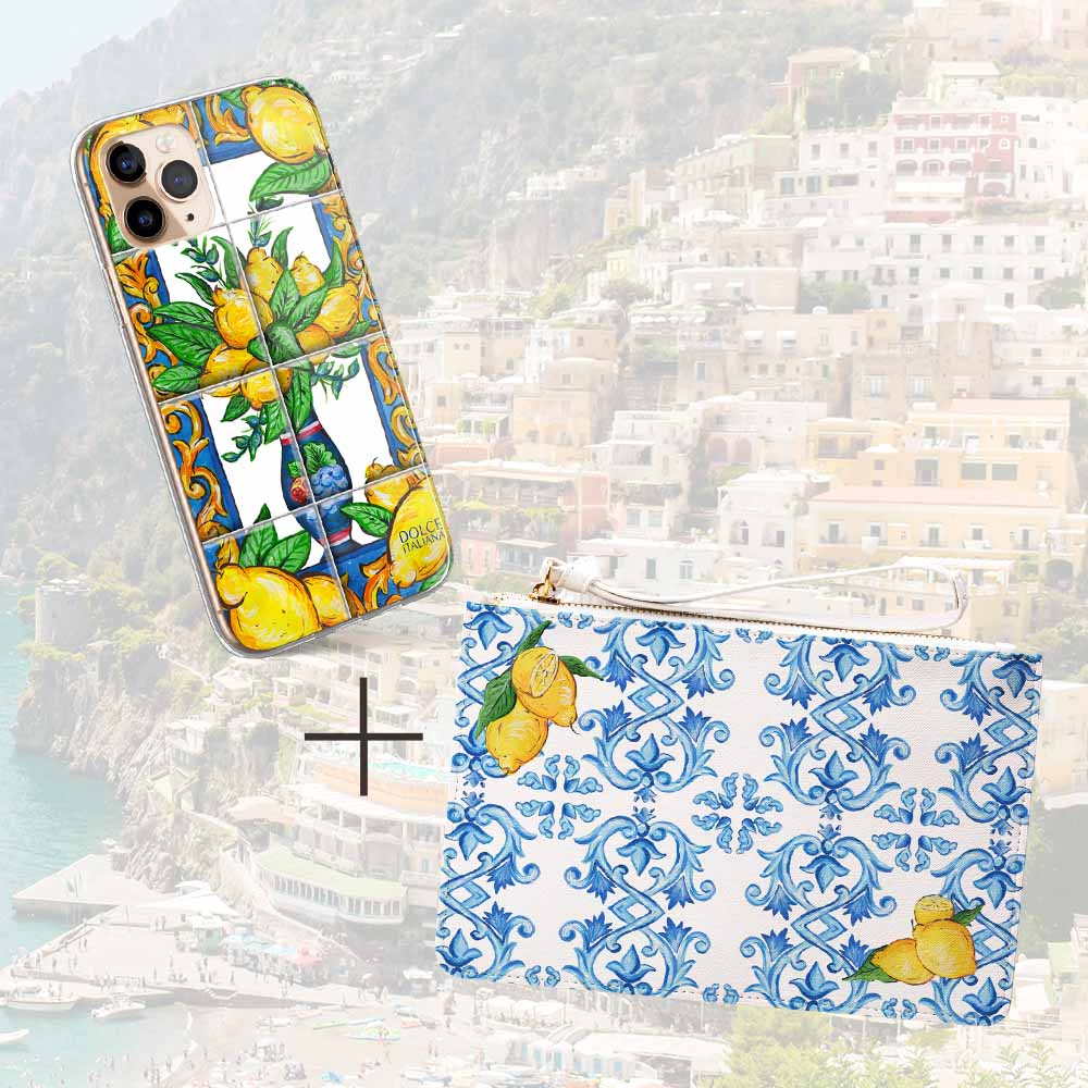 A little taste of Italy, wherever you are. The 'Positano feels like...' traveler pack includes the 'Positano' phone case & famous 'Capri' clutch, both featuring luscious, hand-painted lemon and maiolica-inspired designs.